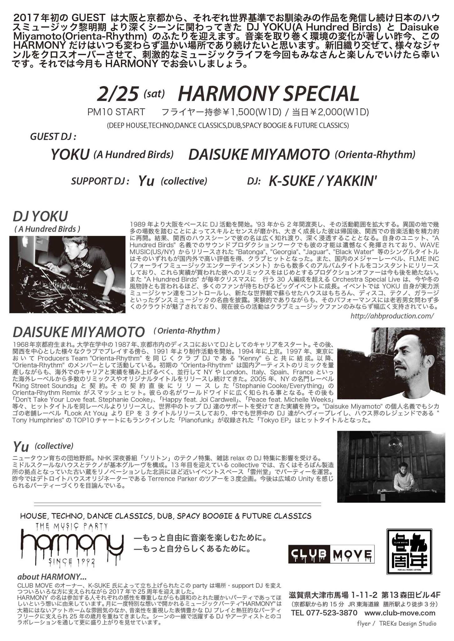 2017年初のGUESTは大阪と京都から、それぞれ世界基準でお馴染みの作品を発信し続け日本のハウスミュージック黎明期より深くシーンに関わってきたDJ YOKU(A Hundred Birds)とDaisuke Miyamoto(Orienta-Rhythm)のお二人を向かえます。