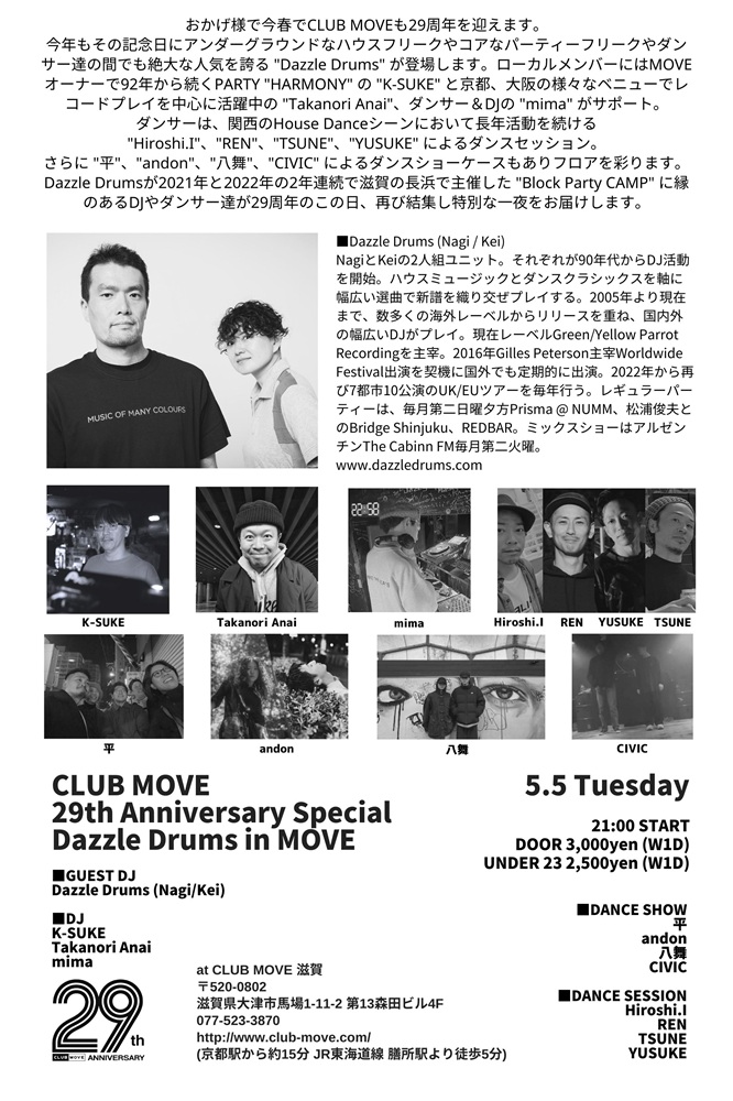 Thanks to everyone, CLUB MOVE will celebrate its 29th anniversary this spring. On this commemorative day, the immensely popular 'Dazzle Drums,' beloved among underground house enthusiasts, core party freaks, and dancers, will appear. Local members supporting them include MOVE owner 'K-SUKE,' host of the 'HARMONY' party since 1992, 'Takanori Anai,' active mainly as a record player at various venues in Kyoto and Osaka, and dancer & DJ 'mima.' Dancers will include a dance session by 'Hiroshi.I,' 'REN,' 'TSUNE,' and 'YUSUKE,' who have long been active in the Kansai House Dance scene. Additionally, there will be dance showcases by 'Taira,' 'andon,' 'Yamai,' and 'CIVIC,' adding color to the floor. DJs and dancers who have connections to the 'Block Party CAMP' hosted by Dazzle Drums in Nagahama, Shiga, in 2021 and 2022 will gather once again on the 29th anniversary to deliver a special night.